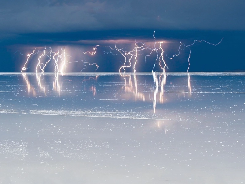 Combining the large expanse of the salt flat with unusual atmospheric conditions at high altitude produces amazing electrical storm displays unlike anywhere else on planet. Unusual electrical field patterns produced by the flat, conductive surface of the salt affect the direction of lightning across the terrain. Visitors can observe amazing lightening displays that seem to dance across the mirror-like surface of the flooded salt flat, generating double images in the reflected water during the wet season, when thunderstorms roll across the salt flat.