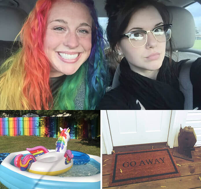Our favorite part of this is the decor of their homes. On the left, we have an inflatable pool and a unicorn. And on the right, a welcome mat that reads, "Go Away."