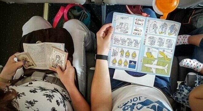 So, who that's reading this get's anxiety when they have to fly? It happens to plenty of people. Almost everyone has wondered what would happen if they were in a plane crash. But, unlike the man on the right, who's reading the safety placard and preparing himself in case something should happen, the woman on the left is reading a prayer book. And those are the two kinds of people on an airplane: one relying on hope and prayers and the other preparing for the worst.