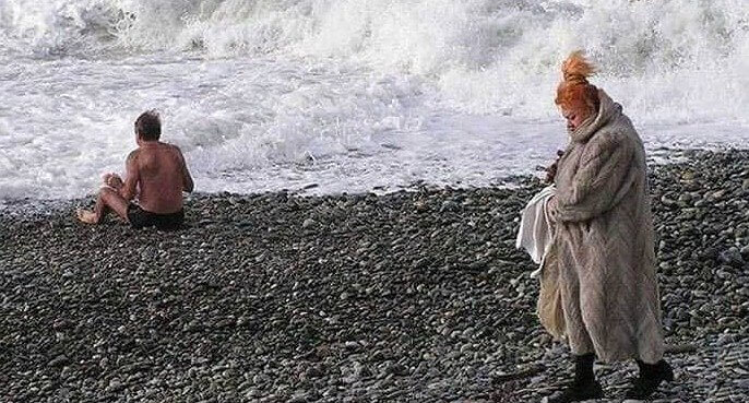 The best part of being at the beach is soaking up the sun and knowing that if you get too hot, you'll be able to hop into that cold water for some refreshment. But what if you wind up at the beach in the winter? Are you still going to do all your same summer activities? One of the people in the picture below decided the answer is yes, but the other one just looks like she's cold.