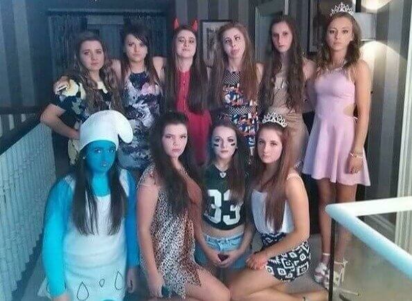 And here we have another classic example of the two kinds of people at a costume party. And it's not hard to see which kind most people align with. While most of the young women in this photo opted for cute, pretty costumes like princesses or cavewomen, one girl decided to go big or go home. She painted her entire body blue to dress up as a Smurf, and we have nothing but love and respect for her.