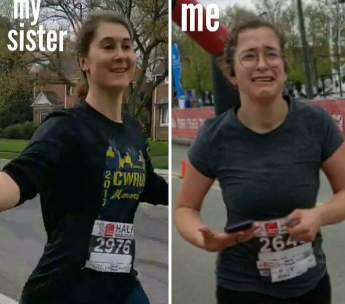 The girl on the right was the one who posted this picture. The context she gave is that her sister, a longtime runner, convinced her that a half-marathon would be doable. But, as you can see from the pictures, the less athletic sister definitely wasn't prepared for how difficult it was going to be. Her sister is breezing through, high-fiving everyone as she runs past with a smile. She, on the other hand, is crying.