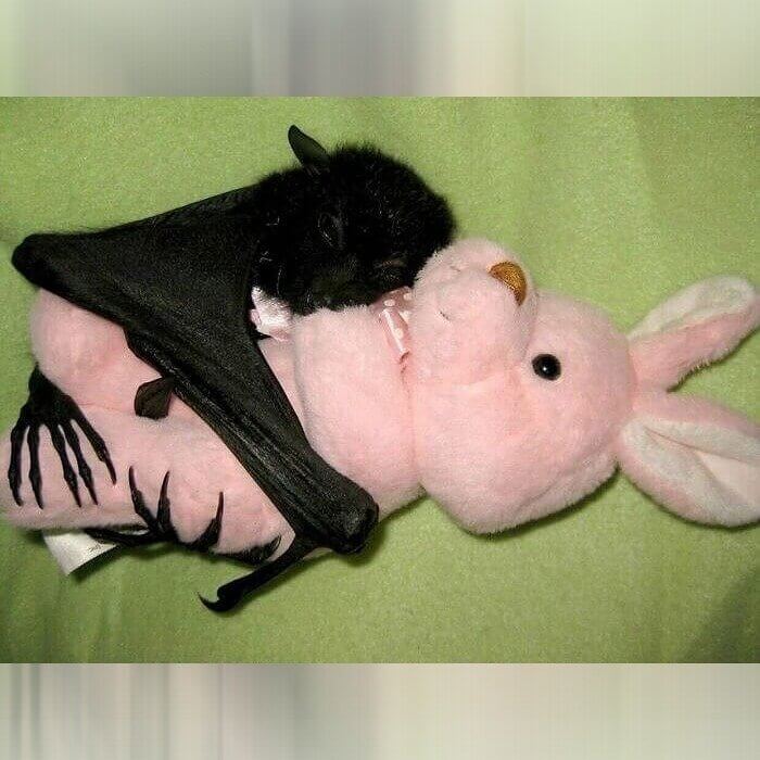 Well, you do not see this every day, for sure. After all, you most likely never see a bat in the light of the day—let alone one that simply seeks some cuddles. Though at first it could seem a little frightening, it's really rather lovely and simple. After all, it's just another animal seeking some love and affection—that of which a teddy rabbit is providing.