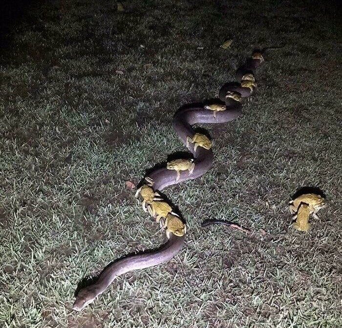 Did you ever think the day would come that you would see, in real life, a bunch of toads climbing on the back of a snack as if to hitch a ride to nowhere? This is the stuff that cartoon movies are made out of and while most of the world probably thought that there was no basis for these ideas, clearly they don't come just out of thin air.