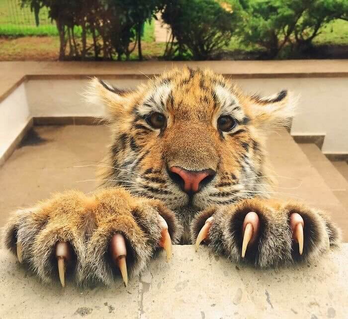 It is so hard to remember sometimes that tigers and other big cats are not friendly. It's hard to remember and it's hard to accept. After all, who doesn't want to just cuddle up to a baby big cat? A baby lion? A baby tiger? It feels wrong that they are as fierce as they are. However, this tiger is not letting anyone forget his fierceness. Just take a look at that cute baby face with the death nails.