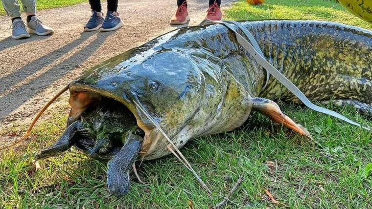 The giant catfish lives on a diet of crustaceans, such as crabs and shrimps. But here’s an image of a giant catfish that unfortunately got more than it bargained for when it tried to eat a turtle for lunch. The turtle was too big, and the catfish choked. This particular catfish was found in a German lake. Its monster-like size alarmed the fisherman and spectators so much that they nicknamed it a dinosaur.