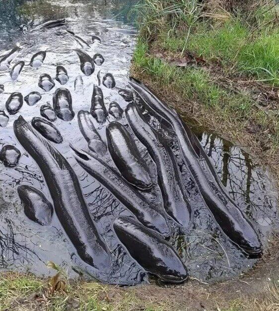 Just imagine yourself swimming or fishing in this river. All is calm, there's a breeze in the air, and the birds are singing. It's a lovely scene, right? But then, out of nowhere, you're confronted by this terrifying sight of freshwater eels rising to the river surface. They're slimy and slippery, and although they're essentially harmless, they are apparently quite bad-tempered. So, if you're on their territory, they may bite you!