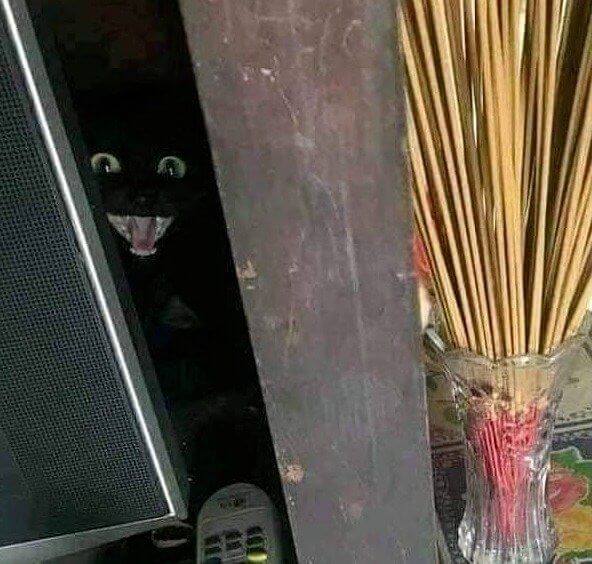 This cat owner posted a photo of their pet on Reddit after their black cat scared them so much they didn't quite make it to the bathroom on time. That's hardcore fear, right? This cat's jaws are wide open as if in readiness to sink its sharp teeth into a spare piece of its owner's flesh. Let's not forget those vivid staring green eyes - we simply have no words to describe our feelings about them.