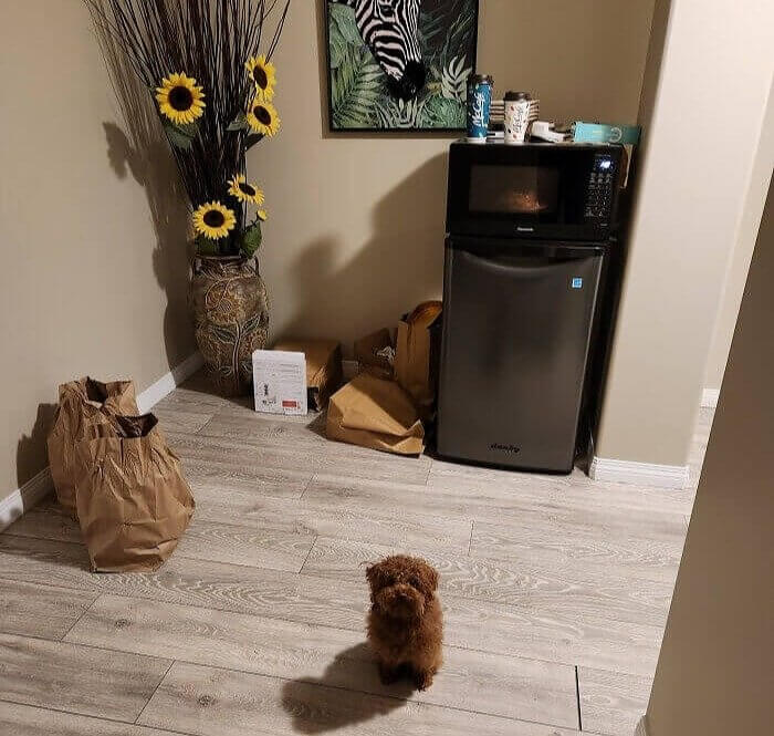 While this cute little toy poodle is none the wiser, the cat is behind him, ready to pounce. Do you spot it in the box behind the dog? You might be able to if you squint.