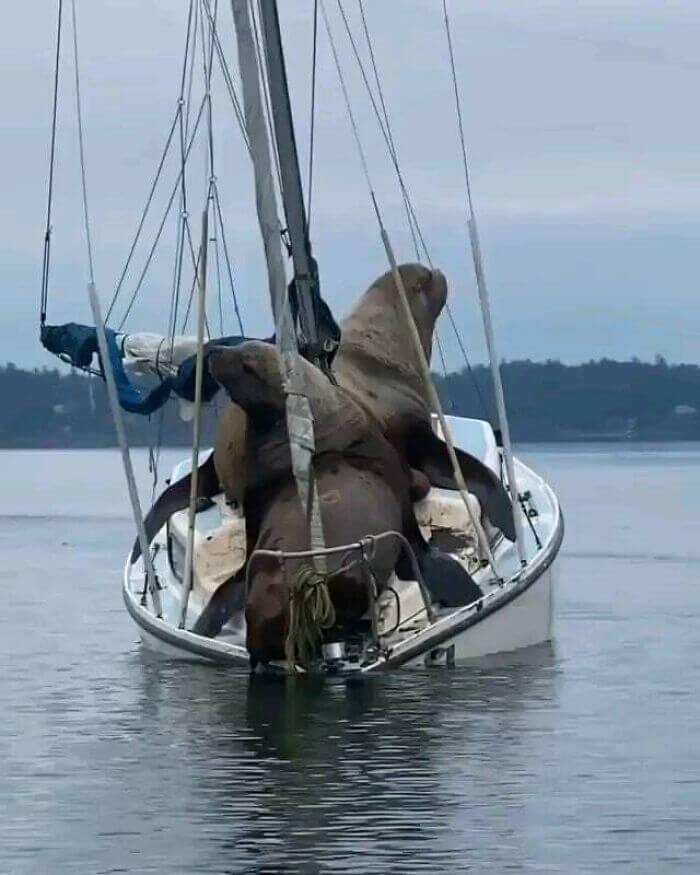This boat is not going to survive these three sea lions, and it's a good thing there weren't any humans on the boat. It would suck to be the owner of that boat because they will never know why there was so much damage or how it sunk.