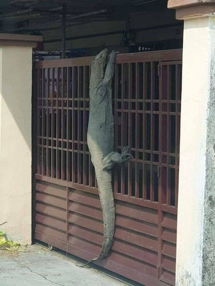 Queen Daenerys needs to get her dragon under control because it is trying to escape again. If you saw this monitor lizard climbing a gate, would you run for your life or stop to take a picture. It's big enough to have its own key for the gate so that it can get in and out easier.