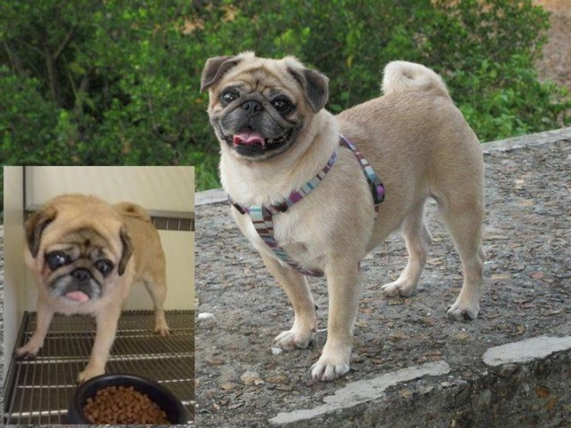 La première photo de Patches montre un carlin encore en adaptation, le regard légèrement incertain. Le cadre suivant présente un compagnon confiant rayonnant de confort, le poids équilibré, l'expression douce. Partagée fièrement en ligne, la comparaison offre une preuve tranquille que la patience, des soins structurés et de l'affection peuvent recadrer une identité, de animal en transition à membre central de la famille.