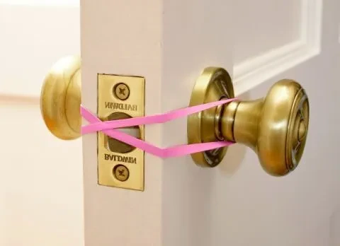 Lorsque vous devez empêcher une porte de se fermer, par exemple pendant que vous transportez des courses ou déplacez des meubles, un élastique peut devenir votre meilleur allié. Enroulez l'élastique autour des deux poignées de porte de manière à ce qu'il croise le loquet, le maintenant ainsi en position ouverte. Cela garde la porte légèrement entrouverte, vous permettant d'aller et venir facilement sans vous soucier qu'elle se referme brusquement ou vous enferme dehors.