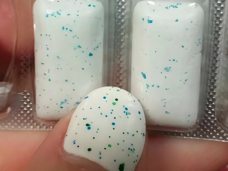 En ouvrant un simple paquet de confiserie, une personne aux États-Unis a eu la surprise de constater que sa manucure — blanche avec des paillettes bleues et vertes — correspondait exactement au motif moucheté du produit. La ressemblance est troublante, presque comme si c'était planifié. Elle n'a probablement pas demandé à son esthéticienne un design inspiré d'une confiserie, mais le résultat est là. C'est une coïncidence esthétique amusante et plutôt jolie, parfaite pour la saison printanière.