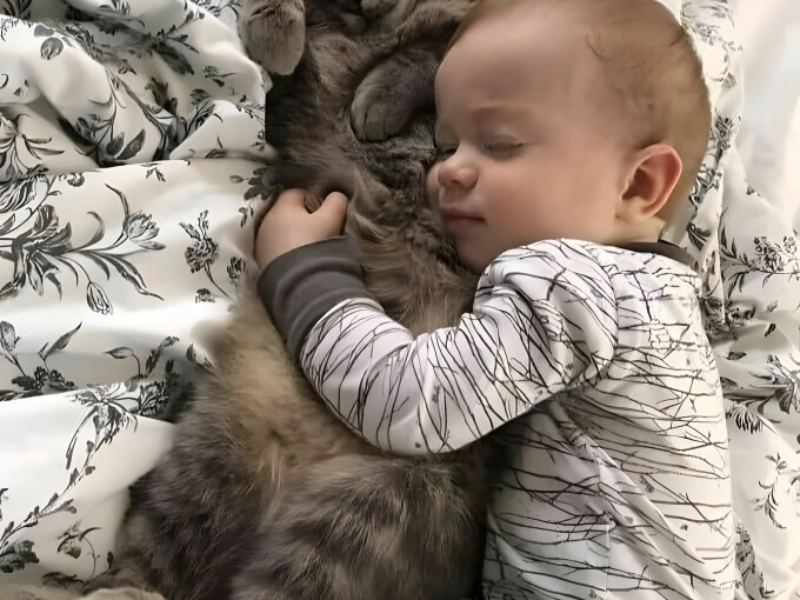 Grandir entouré d'animaux affectueux et bienveillants est une véritable bénédiction, un cadeau précieux et une chance extraordinaire. Cela enseigne naturellement et progressivement la gentillesse authentique, l'empathie profonde, et offre généreusement du réconfort apaisant et une compagnie fidèle. Cette douce photo attendrissante suggère clairement et tendrement que ce tout-petit apprend déjà ces leçons importantes et précieuses, blotti confortablement et en sécurité avec un chat aimant, doux et protecteur.