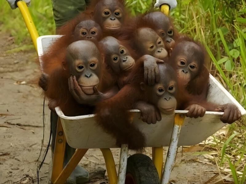 9. Ces bébés orangs-outans orphelins prennent leur bus scolaire en brouette chaque jour pour aller à l'école de la jungle