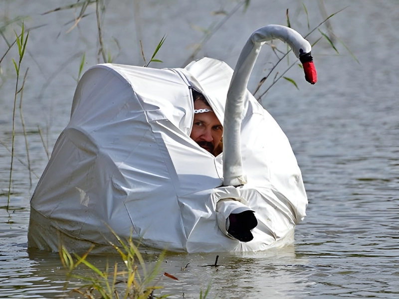 L'essentiel est que le cygne ne tombe pas amoureux de lui. Vêtu de blanc et flottant sereinement, le sujet pourrait facilement être pris pour l'un des élégants oiseaux à proximité. Cette scène fantaisiste estompe les frontières entre l'humain et l'animal, créant un moment d'humour doux et de beauté poétique qui nous invite à imaginer un monde où de telles confusions sont possibles.