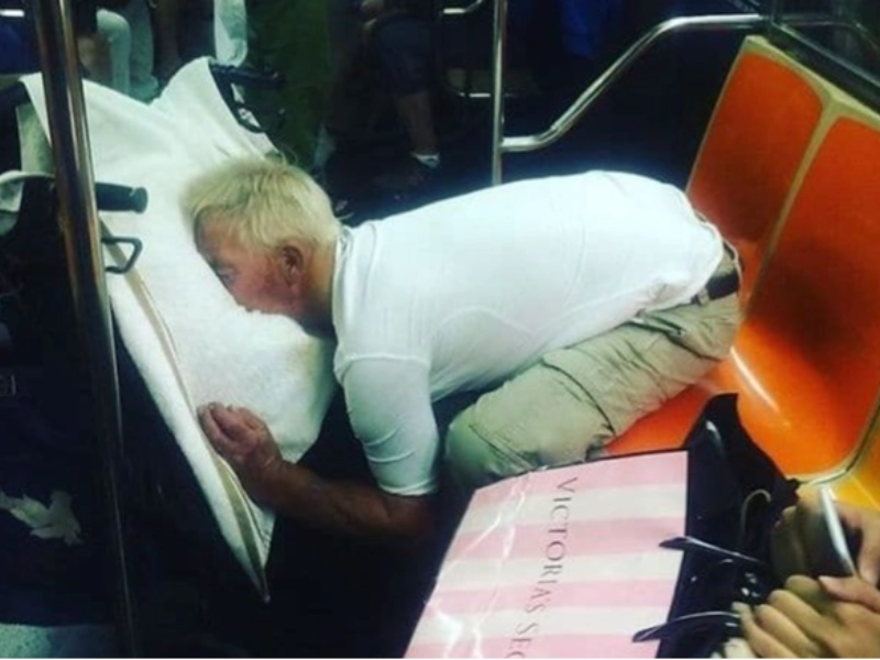 Pour certains voyageurs fatigués, le métro est l'endroit parfait pour rattraper un sommeil bien nécessaire et réparateur. Ce voyageur inventif et adaptable transforma son siège en lit improvisé confortable, complété par une couverture douillette et une posture détendue. Sa capacité remarquable à trouver du confort au milieu du chaos témoigne de l'adaptabilité et de l'ingéniosité impressionnantes des citadins modernes.