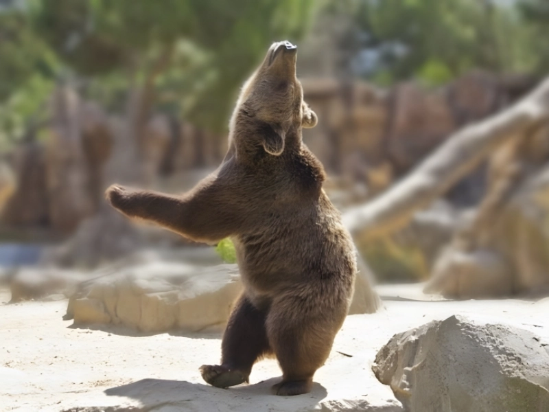 Cet ours semble saisi en pleine danse, pattes levées et corps en mouvement, comme s’il suivait une musique invisible. La pose est joyeuse, presque festive, et elle apporte une légèreté immédiate à l’image. On oublie la puissance de l’animal pour ne voir que l’énergie et la spontanéité du geste. Ce genre de cliché rappelle que le monde sauvage n’est pas seulement fait d’instincts, mais aussi de moments où l’attitude ressemble à un jeu, à une expression libre. La photo donne envie de sourire, tout simplement, comme si l’ours avait décidé de faire le spectacle.