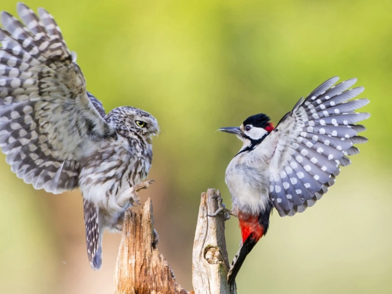 Deux oiseaux semblent comparer leurs envergures, comme dans un petit concours amical. Les ailes déployées attirent l’œil et mettent en valeur la beauté des formes et des plumes. La scène respire la curiosité et une forme d’admiration mutuelle, sans agressivité. On a l’impression d’assister à une démonstration, ou à une manière de se jauger avec humour. Cette image rappelle que la comparaison peut rester légère, surtout lorsqu’elle se fait dans le respect et la familiarité.