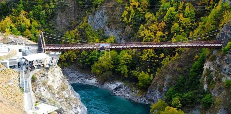 Le pont suspendu des gorges de Kawarau, près de Queenstown en Nouvelle-Zélande, est un lieu légendaire : c'est ici qu'est né le saut à l'élastique commercial moderne. Construit en mille huit cent quatre-vingts pour la ruée vers l'or, il s'élève à quarante-trois mètres au-dessus des eaux turquoise de la rivière Kawarau.