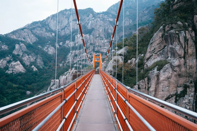 Le pont des Nuages, situé dans le parc national de Wolchulsan en Corée du Sud, est réputé pour être l'un des plus vertigineux du pays. Suspendu à cent vingt mètres au-dessus du sol et reliant deux pics rocheux impressionnants, ce pont orange vif de cinquante-deux mètres offre un contraste saisissant avec la pierre grise et la verdure environnante.