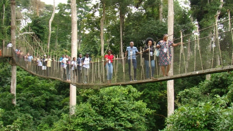 Au cœur du parc national de Kakum au Ghana, la passerelle de la canopée offre une aventure écologique unique et mémorable. Ce système de sept ponts suspendus, s'étirant sur trois cent cinquante mètres à une hauteur de quarante mètres, permet de marcher d'arbre en arbre au-dessus de la forêt tropicale luxuriante.