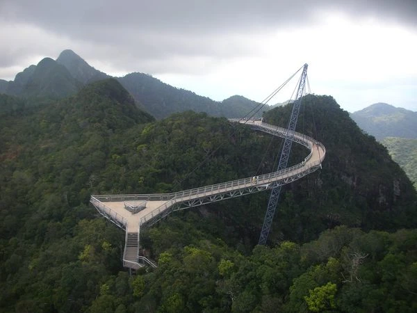 Le Sky Bridge de Langkawi en Malaisie est une prouesse architecturale audacieuse et spectaculaire, suspendue à six cent soixante mètres d'altitude au sommet du mont Mat Cincang. Ce pont haubané incurvé de cent vingt-cinq mètres offre des panoramas à trois cent soixante degrés absolument époustouflants sur la mer d'Andaman et les îles environnantes, allant jusqu'à la Thaïlande par temps clair.