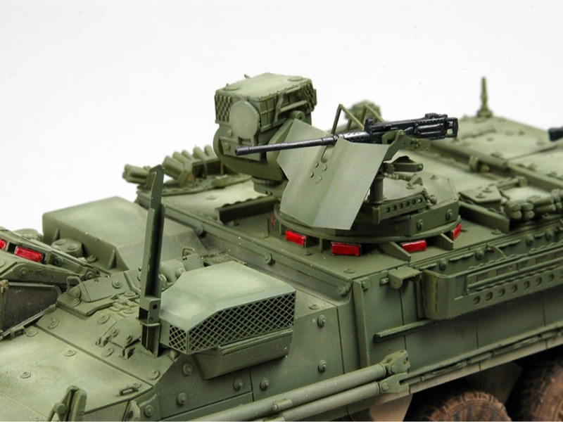 Le M1127 Stryker illustre l’approche américaine axée sur l’intégration électronique et la mobilité sur roues. Sa configuration 8x8 favorise les déplacements rapides, tout en offrant un volume interne permettant d’embarquer des équipements de communication et de capteurs. Les systèmes numériques de type C4ISR sont conçus pour renforcer la compréhension de la situation, en agrégeant des informations issues de plusieurs sources et en les présentant de manière exploitable à l’équipage. Le véhicule peut recevoir une station téléopérée destinée à améliorer l’usage à distance de certains équipements, tout en préservant la protection du personnel. Son moteur diesel, souvent annoncé autour de 450 chevaux, alimente les huit roues et s’appuie sur un système de gonflage centralisé des pneus, utile pour adapter la pression selon le terrain. La conception modulaire facilite l’adaptation à différentes tâches, et le système de conduite de tir intègre des fonctions telles que la vision thermique et la télémétrie laser, afin d’améliorer l’observation et la précision des évaluations.