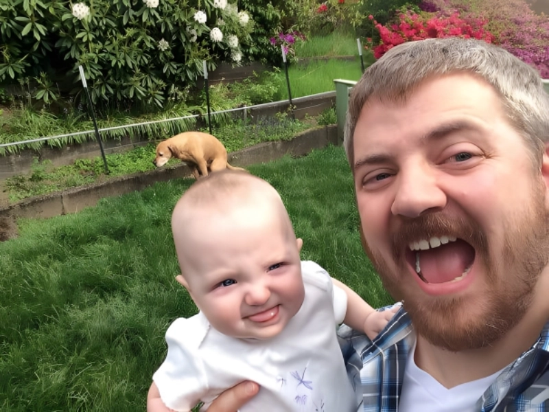 Avez-vous déjà vu une photo qui ressemble à un chien assis sur la tête d'un bébé. Cela contraste avec la scène paisible du jardin mais reste absolument hilarant. On dirait que le petit chien est confortablement assis sur la tête du bébé. C'est une photo unique pour l'album de famille.