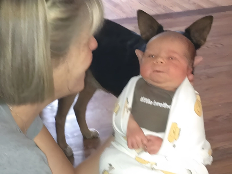 Cela ressemble étrangement à une photo rare de bébé Yoda. Depuis que nous l'avons vu dans la série populaire, nous en voulions davantage. D'accord, ce n'est pas vraiment bébé Yoda de la fiction, juste une intrusion de chien parfaitement synchronisée donnant au bébé des oreilles semblables à celles de Yoda. Le bébé doit penser avec amusement : "Je suis tout ouïe, maman."