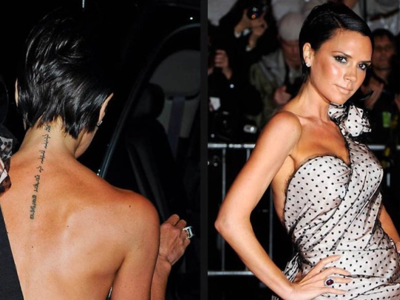 L'icône de la mode Victoria Beckham a choisi de célébrer son mariage avec David Beckham à travers l'encre permanente. Elle porte une inscription verticale en hébreu qui descend le long de sa colonne vertébrale, issue du Cantique des Cantiques : « Je suis à mon bien-aimé, et mon bien-aimé est à moi ».