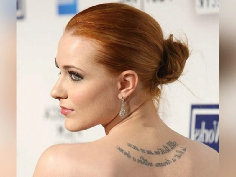 Evan Rachel Wood affiche son amour pour la littérature classique avec une citation d'Edgar Allan Poe tatouée dans son dos : « Tout ce que nous voyons ou paraissons n'est qu'un rêve dans un rêve ». Cette phrase mystérieuse souligne sa nature introspective et artistique.