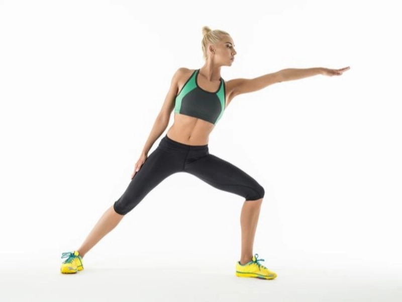 Tenez-vous debout, pieds écartés de trente à trente-cinq centimètres, bras le long du corps. Contractez légèrement les muscles abdominaux, inspirez profondément et fléchissez légèrement les genoux comme pour vous asseoir. Faites une fente latérale vers la droite en étirant le bras droit du même côté et faites glisser la main gauche le long de votre corps. Maintenez la position pendant huit secondes, en vous inclinant légèrement à droite. Effectuez le mouvement uniquement sur le côté, pas vers l'avant ou l'arrière. Répétez deux à trois fois de chaque côté. Chaque session d'entraînement dure environ une minute. Écoutez votre corps et respectez vos limites personnelles.