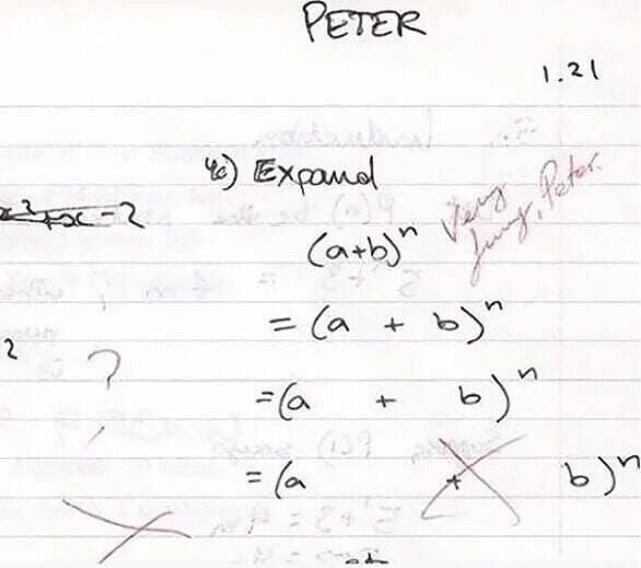 The student was told to expand an arithmetic equation, but this time they chose to do something different. When the teacher instructed the child to expand an equation, the child just made the letters more apart. The teacher then said, "Very funny," which sounds like sarcasm. We know for sure that Peter didn't gain points for his answer to this question, but we have a feeling that he was still happy with it.
