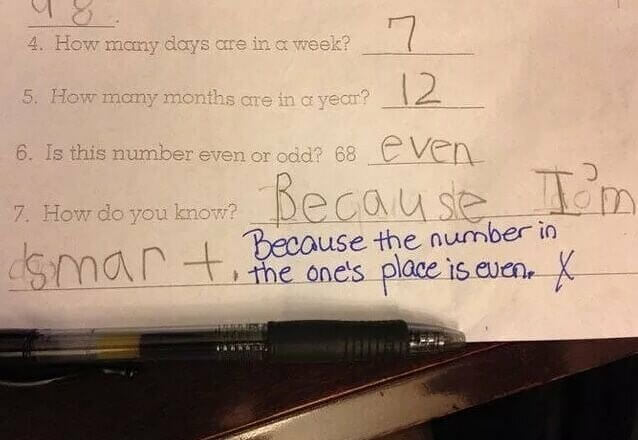 After answering all the questions on the test, this child clearly felt more sure of themselves. We can tell that they got the first few questions right, and we can only guess that they started to feel a little too smart for their own good when they knew the answers to the questions they were being asked. This is why they answered the last question the way they did. When asked how they know if a number is even or odd, they said, "Because I'm smart."