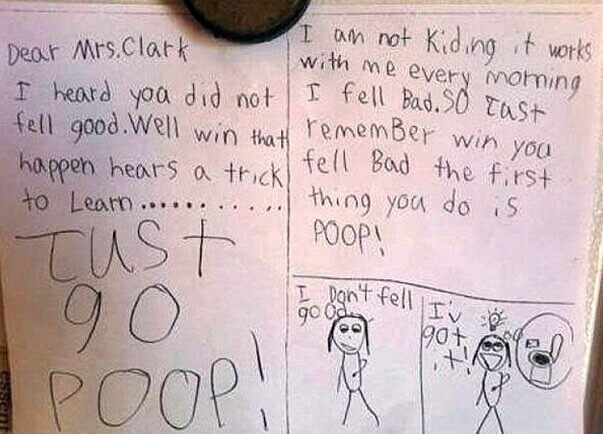 When this cute boy found out that his teacher wasn't feeling well, he knew exactly what to say to her. This child didn't send Mrs. Clark a note saying "Get well soon" or "I hope you feel better soon." Instead, they decided they would give her some helpful advise. They say that emptying your bowels is the best way to feel better quickly, and they know this from experience. They added, "I'm not kidding. It works for me every morning when I feel bad."