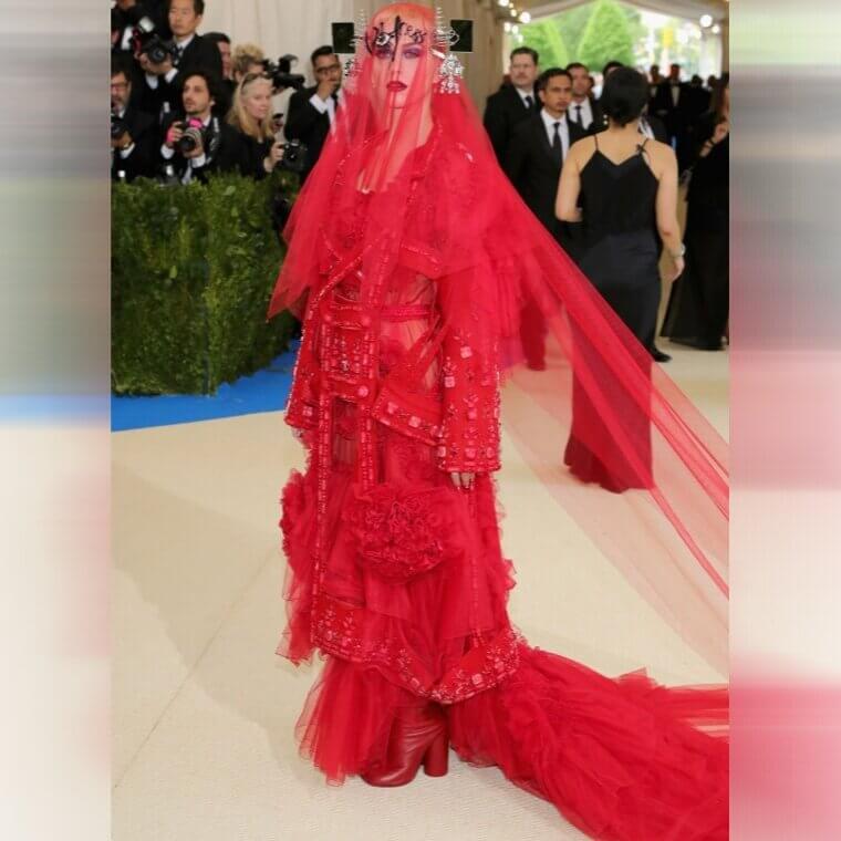 This stunning outfit mixes modern art with old-fashioned glamor. The deep red color is really attractive, and the elaborate decorations and sheer layers make it even more so. The dramatic veil gives off an air of mystery and class, making a statement that is both bold and hard to forget. The structural shape and attention to detail reveal a wonderful mix of old and new. This outfit really captures the spirit of bravery and elegance on the red carpet.