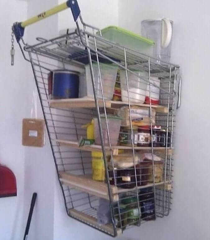 Have you ever thought about stealing one of those shopping carts from the stores? No? We haven't either. But now that we've seen this, we might want to check if we can find one to buy legally online. This person grabbed a metal shopping cart from their neighborhood grocery store, chopped it in two, and used it as a kitchen cabinet. It's very unique and has a touch of modern-industrial-chic to it.
