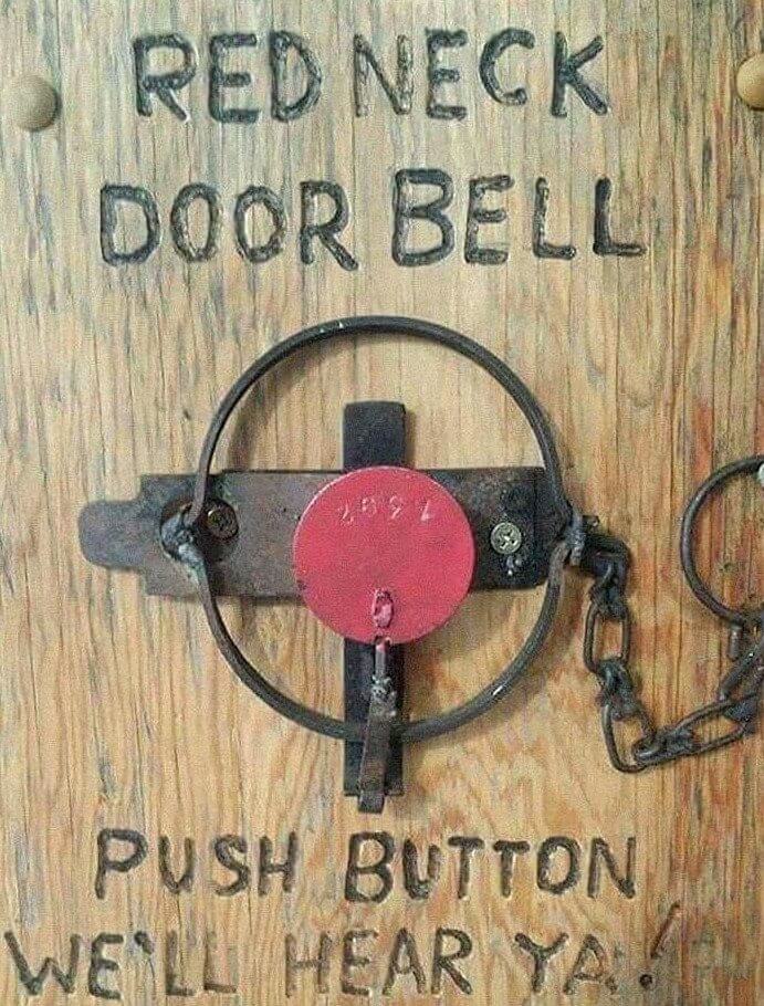 Doorbells are so fancy these days; some even have cameras and customizable rings! But these people didn't want any of that. In fact, it looks like they don't want visitors at all. When their regular doorbell broke, they put a bear trap in its place. If you press the button that says "Red Neck Door Bell," your hand will be stuck, and your scream will let everyone inside the house know you've arrived.