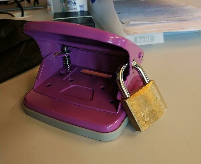 Sharing office space is like a war, and you could lose your stuff if you do. Each year, the person with the most pens wins. This person took their office war games to the next level with their hole puncher. They put a lock on it so that only they can use it, so there's no point in "borrowing" it.