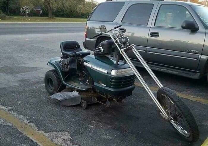 Renovations are a great way to keep your old gadgets and technologies up to date without spending a lot of money on new ones. You might be thinking about remodeling your kitchen or putting a new stereo system in your car. But this person is already thinking way beyond that. They took their old lawn mower and turned it into a motorcycle.