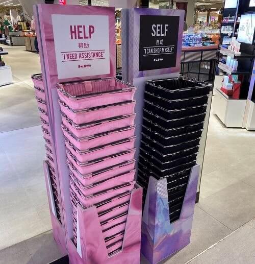 If you want store workers to come up to you and help you, get a pink basket. Take a black one if you want to be alone. It's so easy and yet so smart!