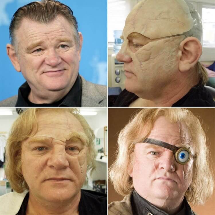 Brendan Gleeson played Mad-Eye Moody in the Harry Potter movies. He needed a lot of prosthetics and two and a half hours of makeup. He stated there were several silicon components and an animatronic-controlled eye.