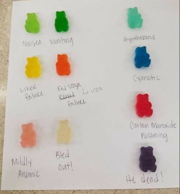 We can't say enough good things about nurses. They work long hours and have to deal with terrible things all the time. Being a nurse comes with a lot of obligations, and sometimes people are unpleasant even when you're the one helping them. The nurses thought it would be funny to give all the gummy bears names that were similar to the hues of diseases. You can move from pale green (sick) to dark purple (he's dead). They are able to find humor in the little things, even if they have a lot on their plate.