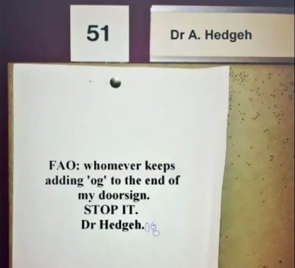 Dr. Hedgeh must truly dislike hedgehogs because she doesn't like it when people add "og" to the end of her name. She might have played Sonic the Hedgehog too much as a kid and learned to hate the blue video game character since she kept losing. This doctor would not like the simple prank either because her classmates called her "hedgehog" when she was a kid. No one knows for sure why this doctor hates jokes so much, but she has to relax because they're all in good fun.
