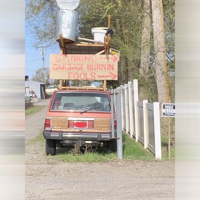 Most of the time, people keep their personal problems to themselves. These neighbors, on the other hand, let everyone know what they don't like. So, everyone in the neighborhood has to see this wonderful sign on top of that rusty old Jeep that says the property owners next door are idiots who burn trash. Of course, this can't be making anyone happy. We don't certain if we'd really like the scent of burning trash in our backyard, though.