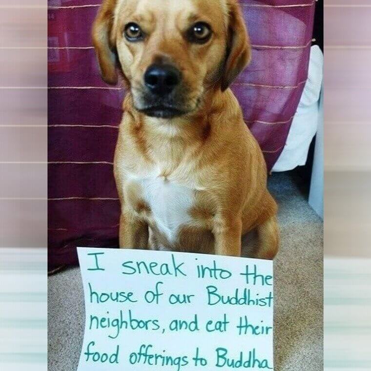 It's always nice to know that your new neighbors will be polite and tolerate your religious views and customs. But we never think to talk to the pets. The Buddhist family that moved into the neighborhood checked to make sure that no strangers would bother their customs, but they failed to ask the animals in the area, and this dog ended up taking more than his fair part from their offering plate to Buddha.