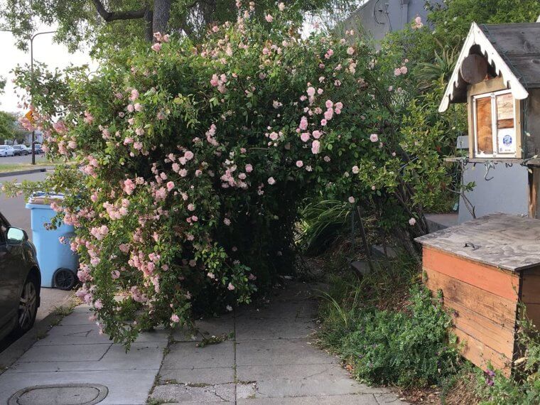 This person's rose bush in the front yard has gotten so big that it's covering the whole sidewalk. It's evident that their neighbors haven't used their hedge clippers in a long time. It would be so annoying to have to walk on this sidewalk and then go into the street to get around this hedge that hasn't been clipped. Also, a plant isn't as healthy when it has so much weight hanging over it like that!