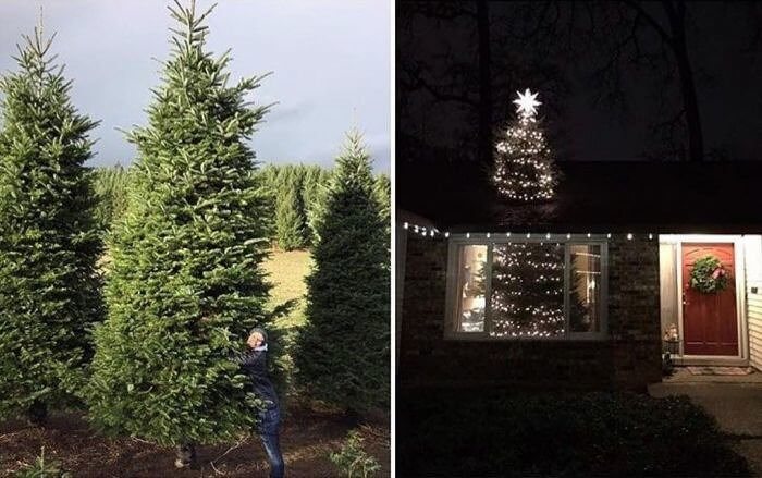 It should always be joyful and playful, yet it's wonderful to show off to your neighbors. It's even better if you can make everyone laugh while you do it. This family had the brilliant notion to get a Christmas tree that was way too big for their house. Then they cut it in half and made it look like it was going from the floor of the living room all the way up to the roof.